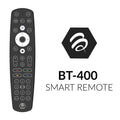 Our most advanced remote, The BT-400 is a smart remote that works in conjunction with our new BuzzTV Smart Remote App (The BuzzTV Smart Remote App is currently available on the X5, HD5 and U5 models) This app allows you to source pair the BT-400 remote directly to your TV; which allows you to control the TV Power On/Off feature, Volume up and down, and TV input source.